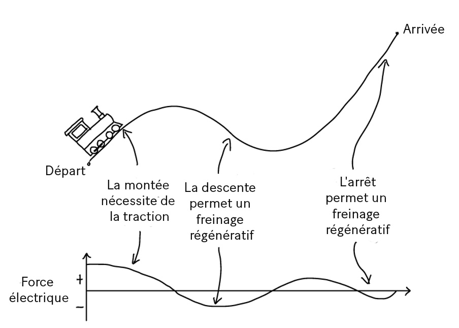 La force électrique appliquée au train. Il s'agit d'une force positive si le train accélère, et d'une force négative s'il freine. Le freinage par récupération ralentit le train en utilisant les moteurs comme générateurs et en renvoyant l'énergie récupérée vers le réseau.