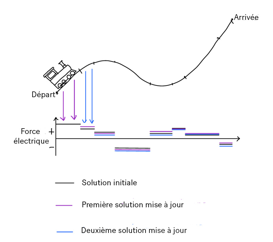 C'est là que le contrôle prédictif peut être utile. Voici comment cela fonctionne : avant le départ du train, la force électrique optimale pour le trajet est calculée à partir des meilleures informations disponibles. Cependant, cette force électrique calculée n'est utilisée qu'au début du trajet. Après un court laps de temps, des capteurs recueillent des informations sur la position, la vitesse et l'accélération actuelles du train. Sur la base de ces informations, un nouveau trajet optimal est calculé pour la partie restante de la voie et une force révisée est appliquée. Ce processus consistant à obtenir des informations en temps réel, à recalculer le trajet optimal et à mettre à jour la force appliquée est répété régulièrement tout au long du trajet, ce qui permet d'adapter et d'optimiser le trajet à la volée :